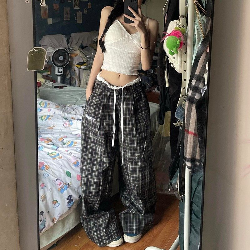 大码胖mm美式复古格子裤女宽松阔腿裤秋季慵懒风休闲裤垂感拖地裤