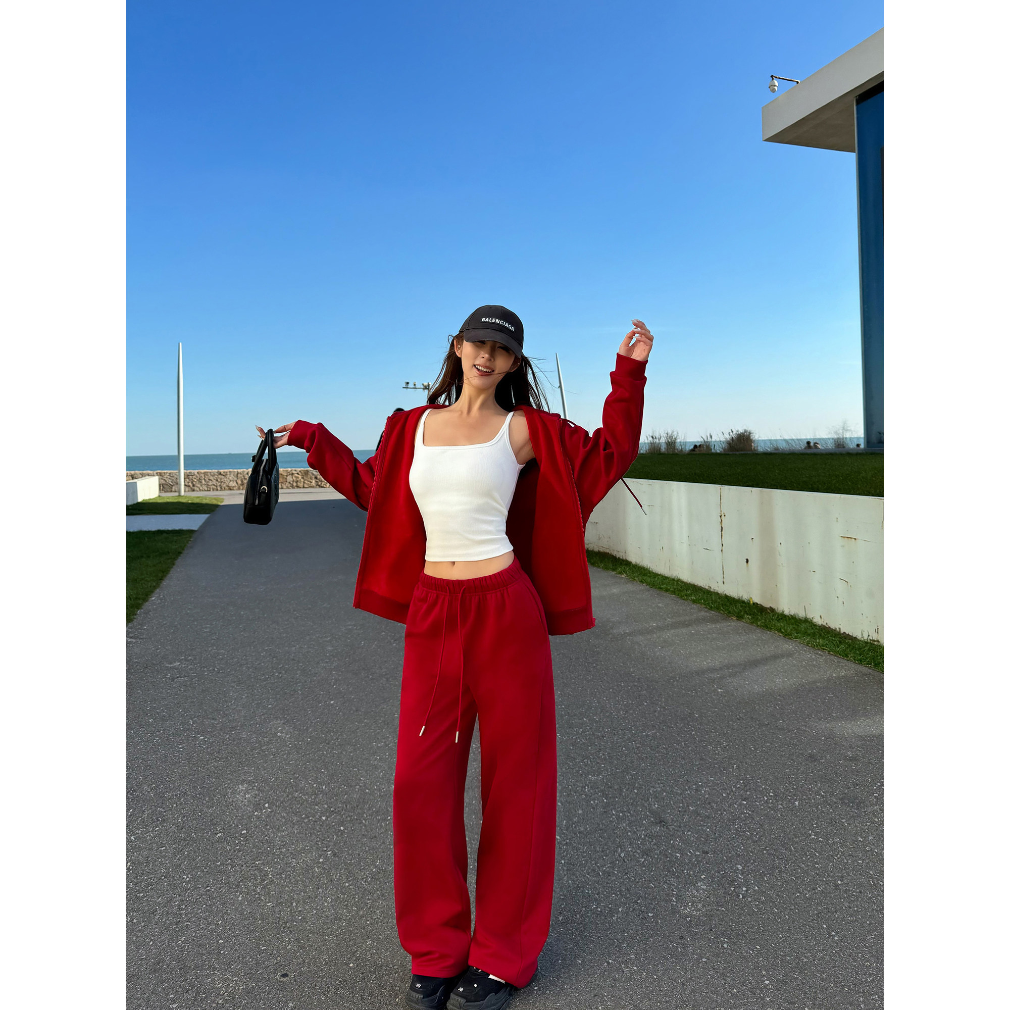 NEVA HU幕后玩家 红色连帽拉链加绒卫衣女宽松阔腿直筒裤休闲套装