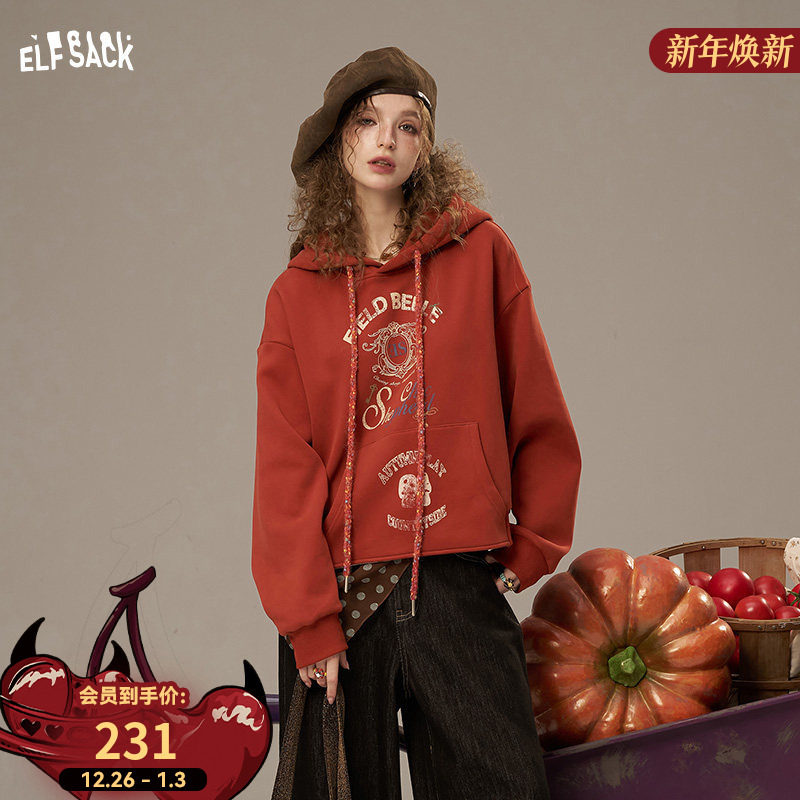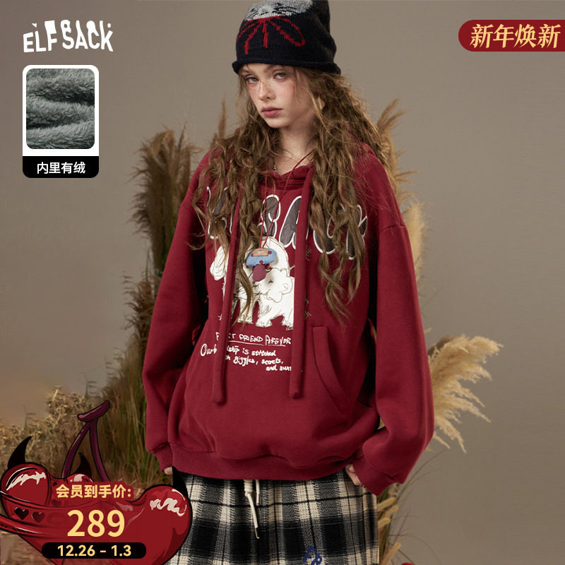 妖精的口袋复古小象加绒连帽卫衣女2025年冬新款新年战袍红色上衣