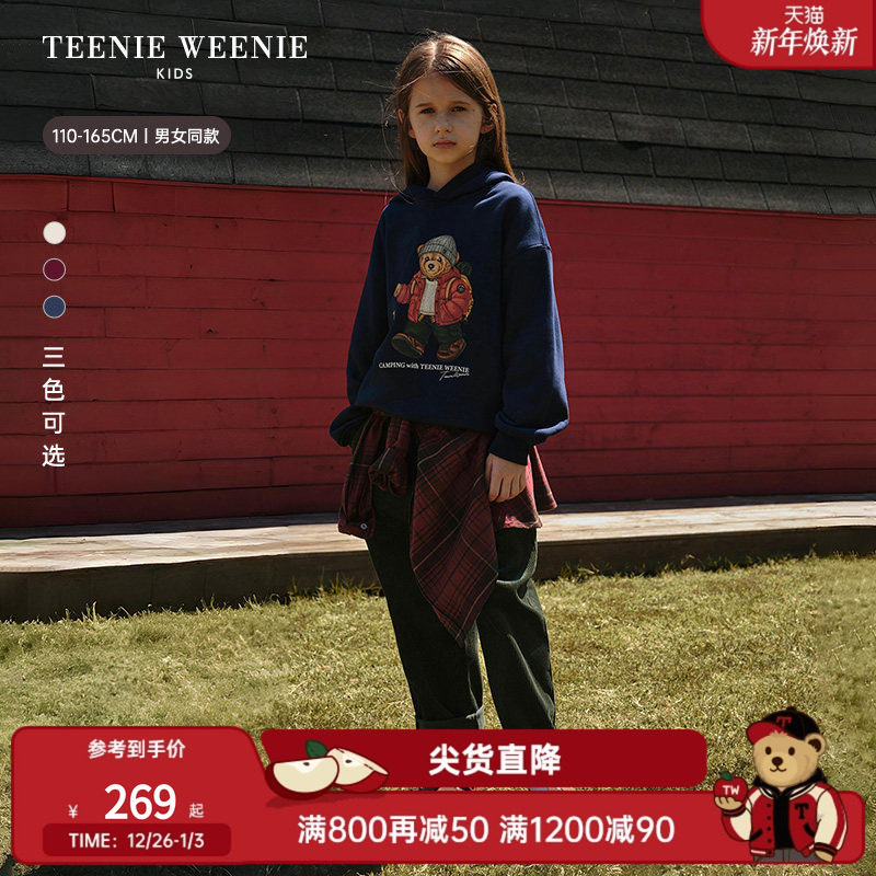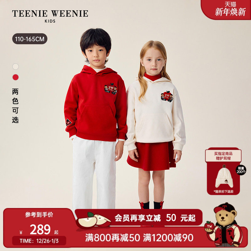 TeenieWeenie Kids小熊童装26新款男女童加绒红色袋鼠兜连帽卫衣