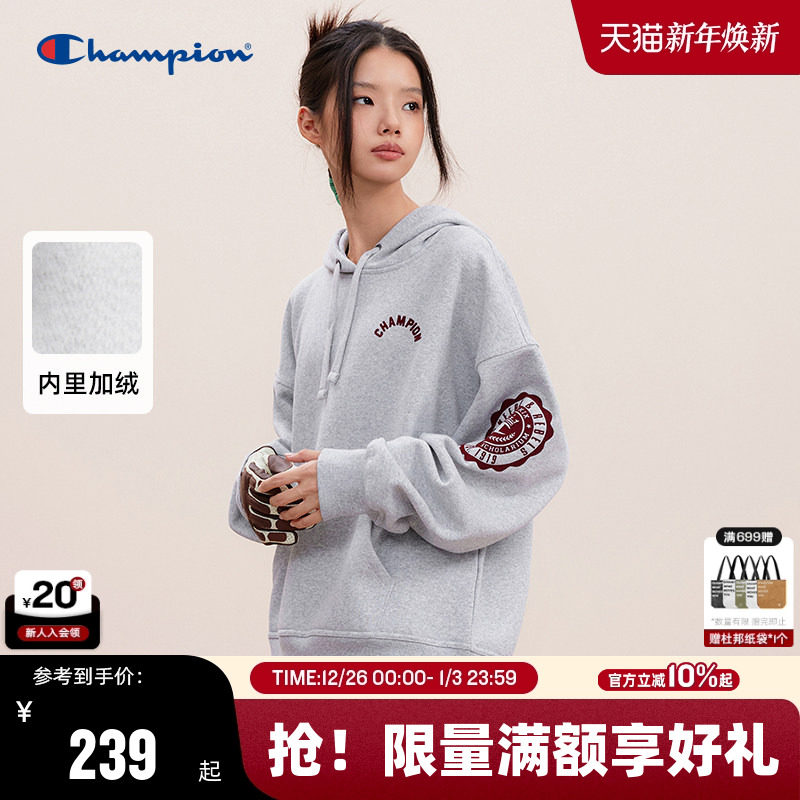 Champion冠军连帽卫衣女秋季新款红色本命年复古保暖加绒冬季潮