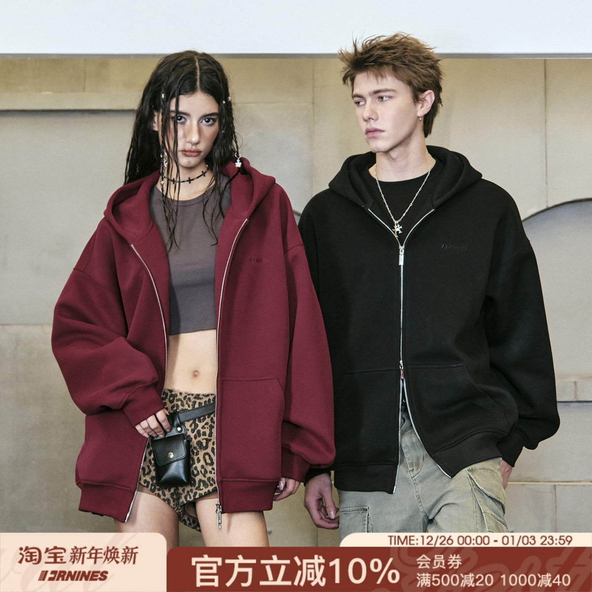 FORNINES重磅刺绣连帽开衫红色加绒卫衣男女情侣装潮牌秋冬厚外套