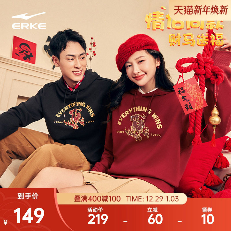 财马送福丨鸿星尔克加绒卫衣冬季新款男女新年本命年红色连帽衣服