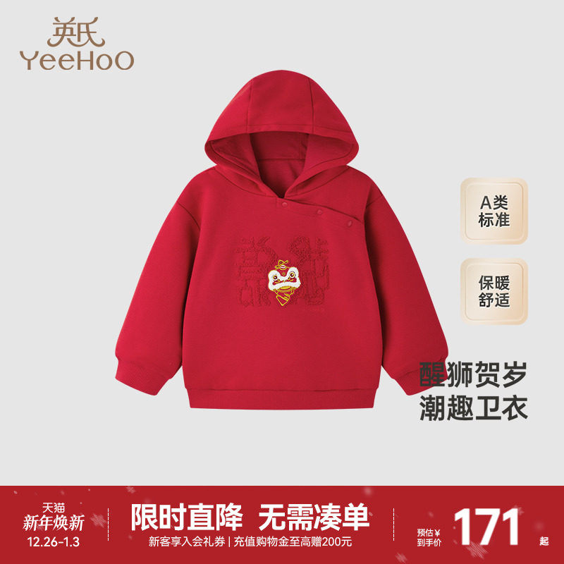 英氏儿童连帽卫衣春秋季加绒男童女童喜庆拜年服新年红色本命过年