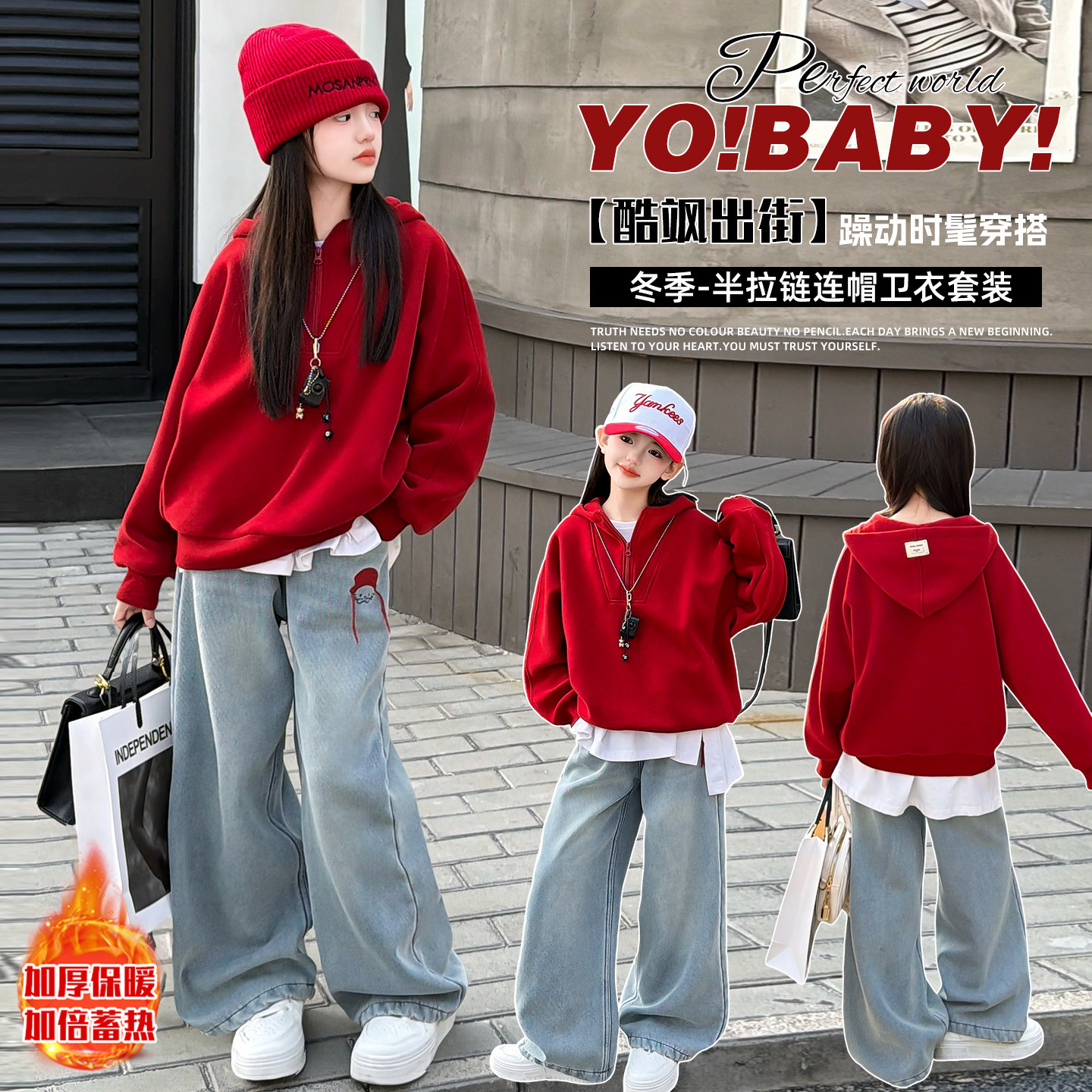 女童冬装加绒红色连帽卫衣冬季女孩大童加厚半拉链上衣牛仔裤套装