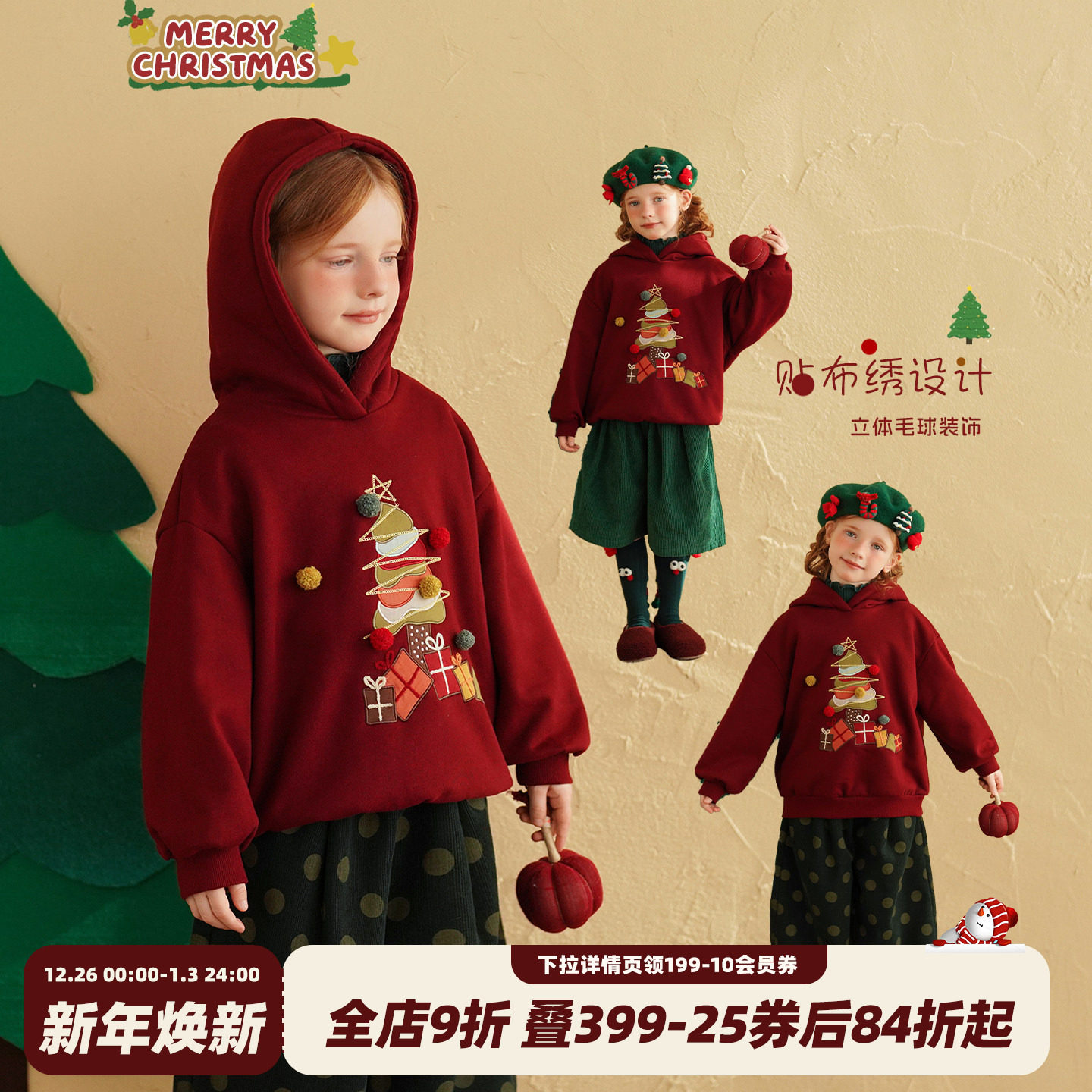 砚台家女童圣诞红色卫衣连帽冬装新款宝宝一体绒卡通保暖加绒上衣
