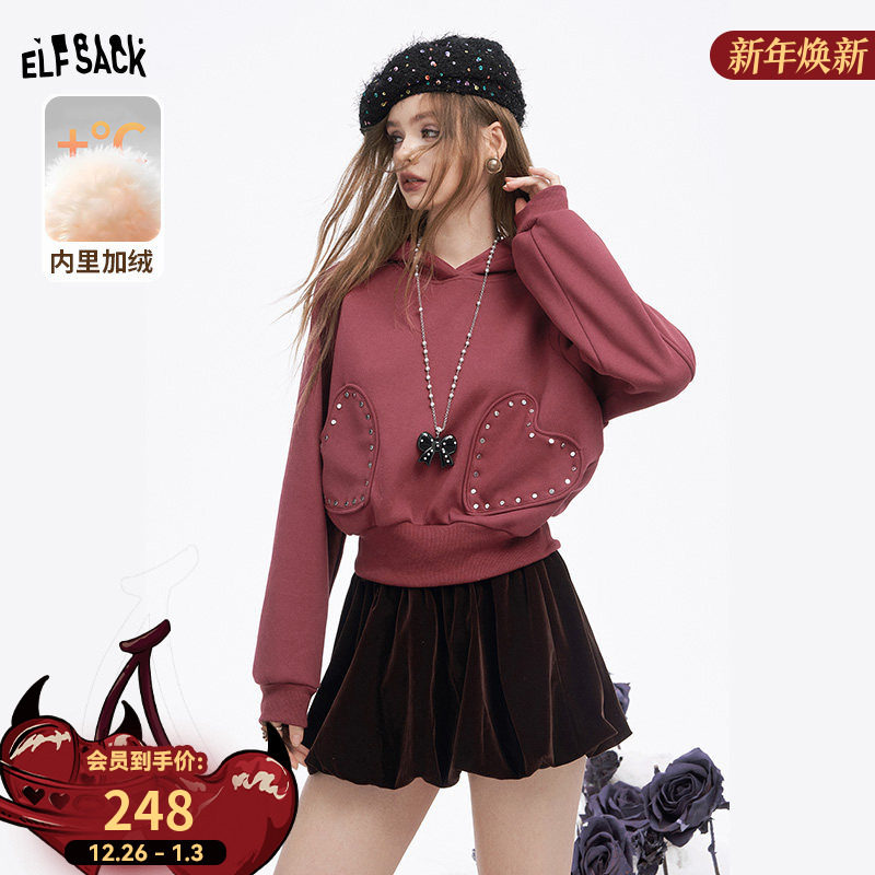 妖精的口袋铆钉连帽加绒卫衣女2025年冬新款新年战袍短款红色上衣