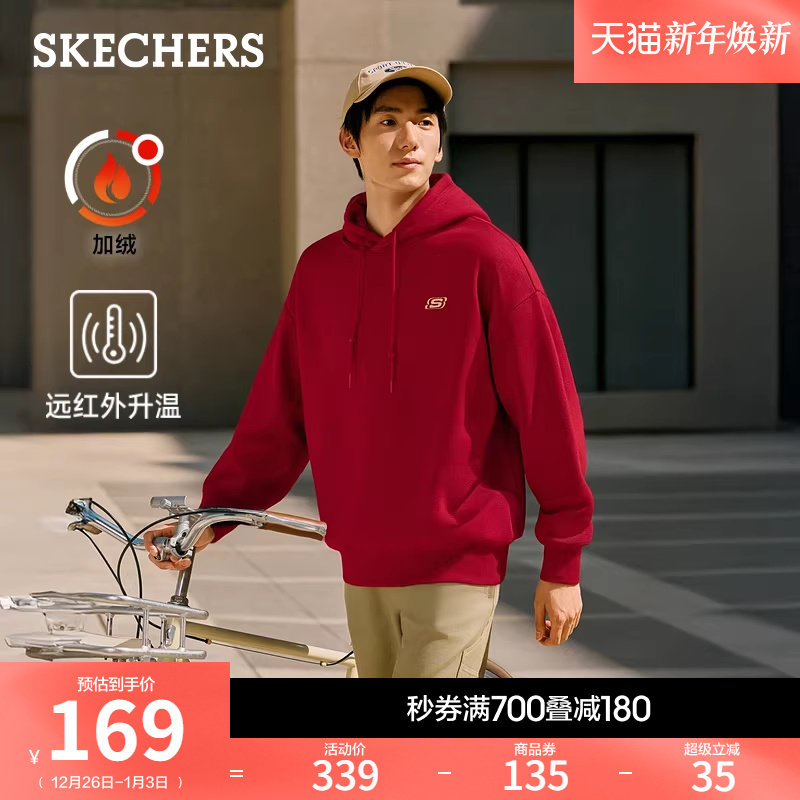斯凯奇2026新年战袍男女红色连帽卫衣百搭情侣加绒纯棉冬灰色上衣