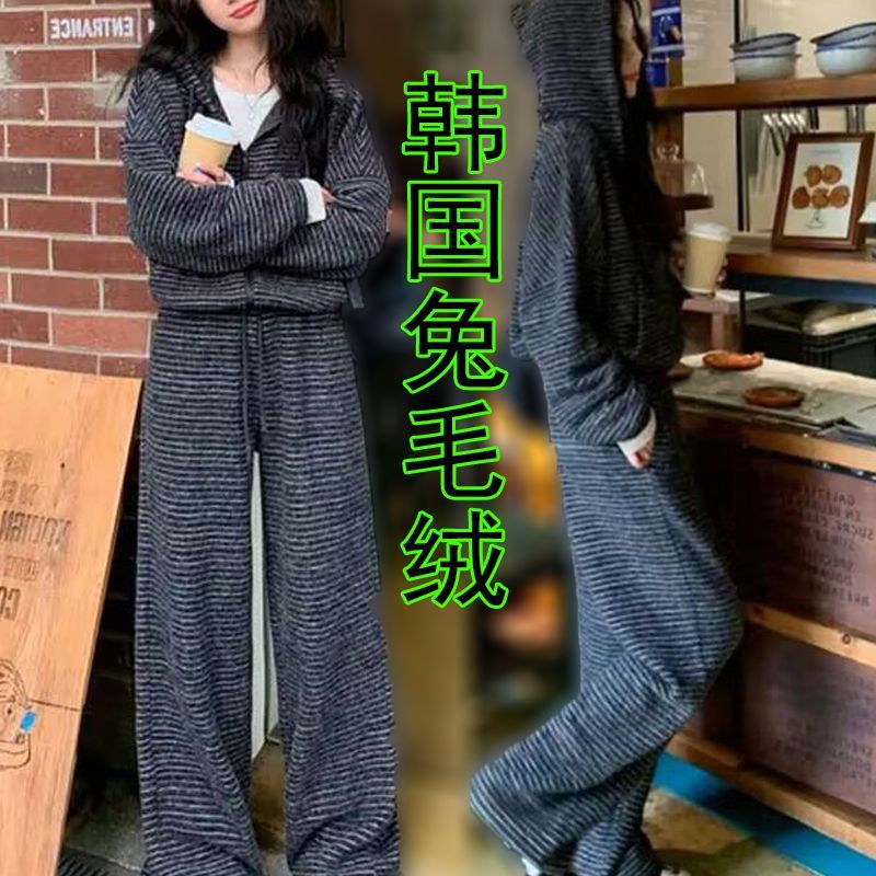 韩国兔毛绒时尚连帽运动套装女秋冬休闲开衫卫衣外套阔腿裤两件套