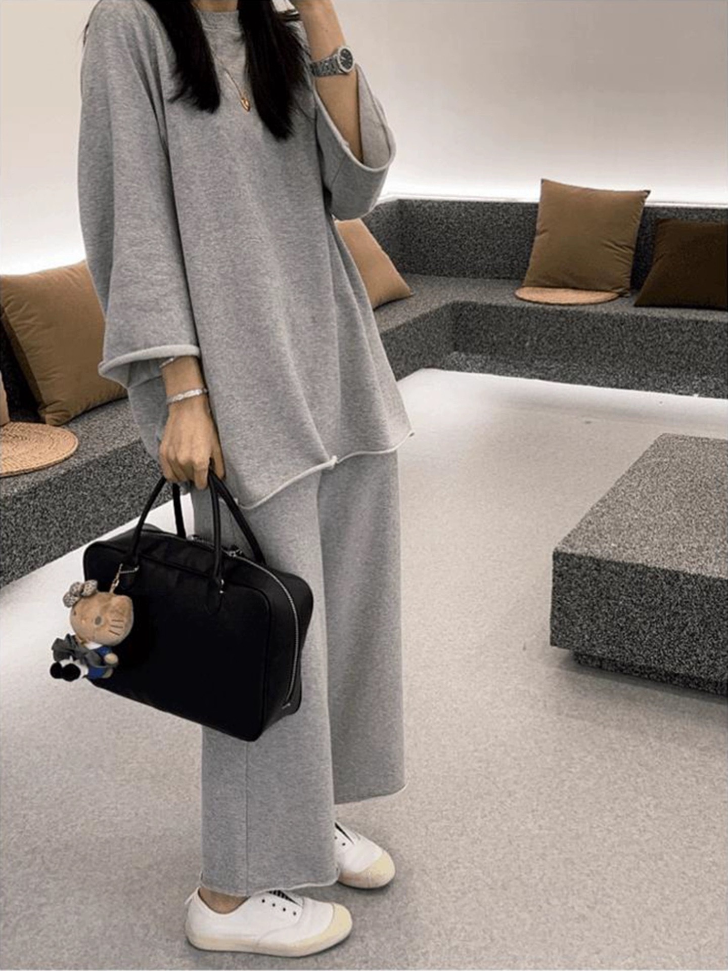 韩国chic秋季运动风休闲宽松百搭长袖卫衣+高腰长款阔腿裤套装女