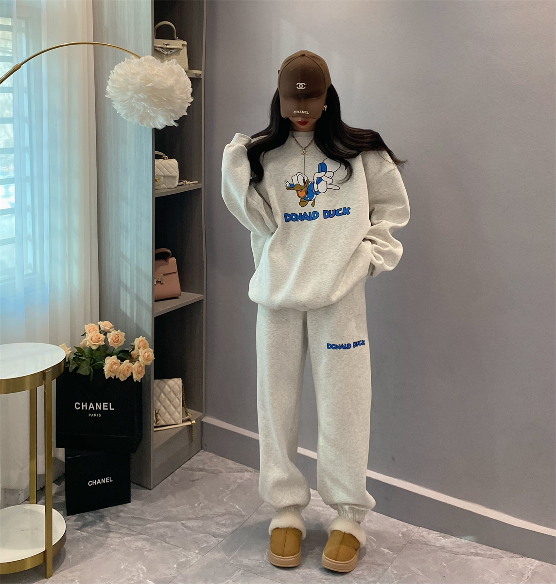 韩国卡通洋气时尚宽松加绒卫衣套装女装收口哈伦休闲运动裤两件套