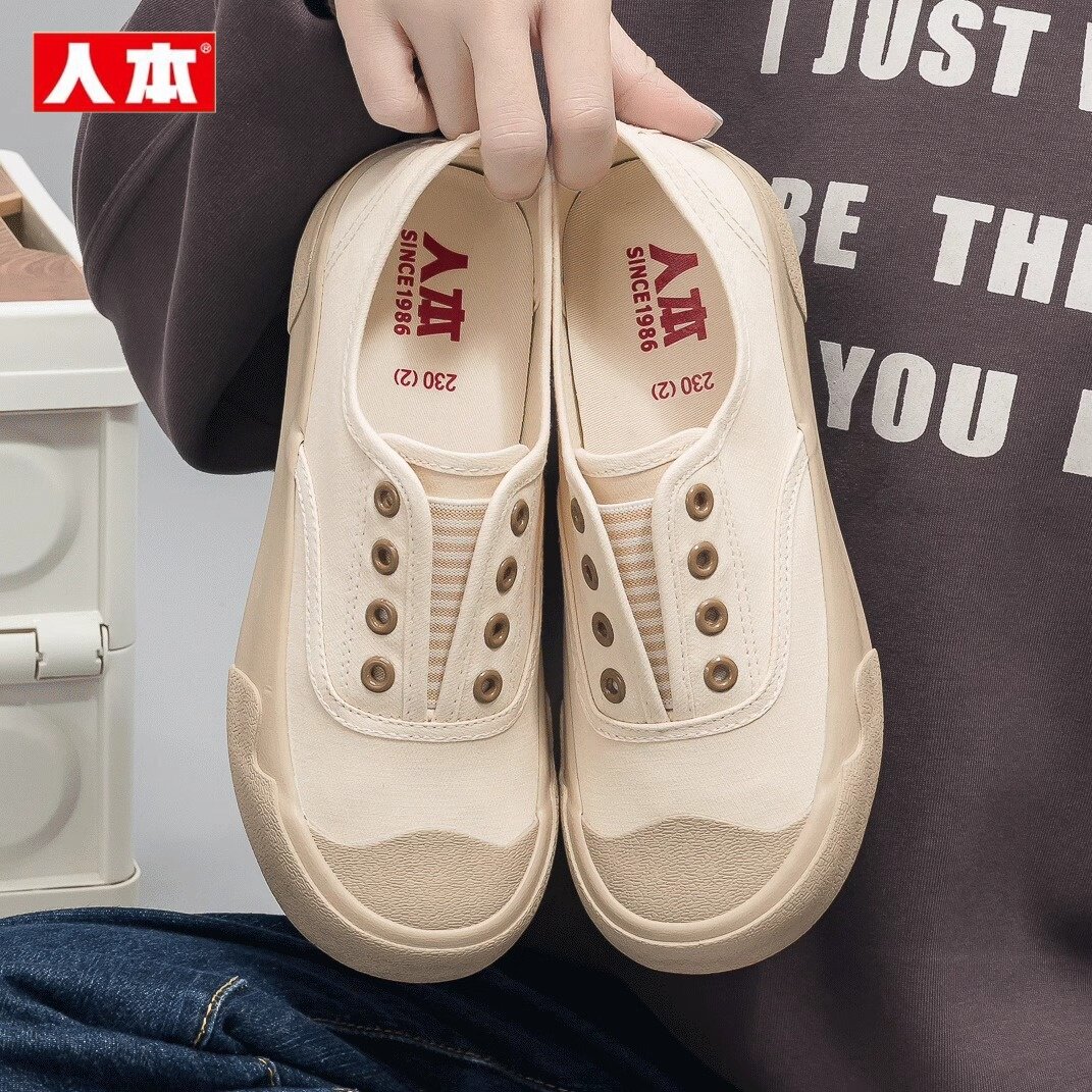 人本一脚蹬懒人帆布鞋女2026新款韩版百搭平底休闲板鞋学生小白鞋