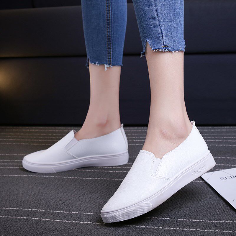 春秋小白鞋女秋韩版白色皮面帆布鞋平底百搭女鞋学生一脚蹬懒人鞋