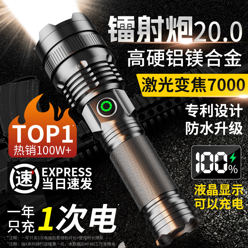 手电筒强光充电式超亮白激光超长续航大容量户外远射战术便携家用