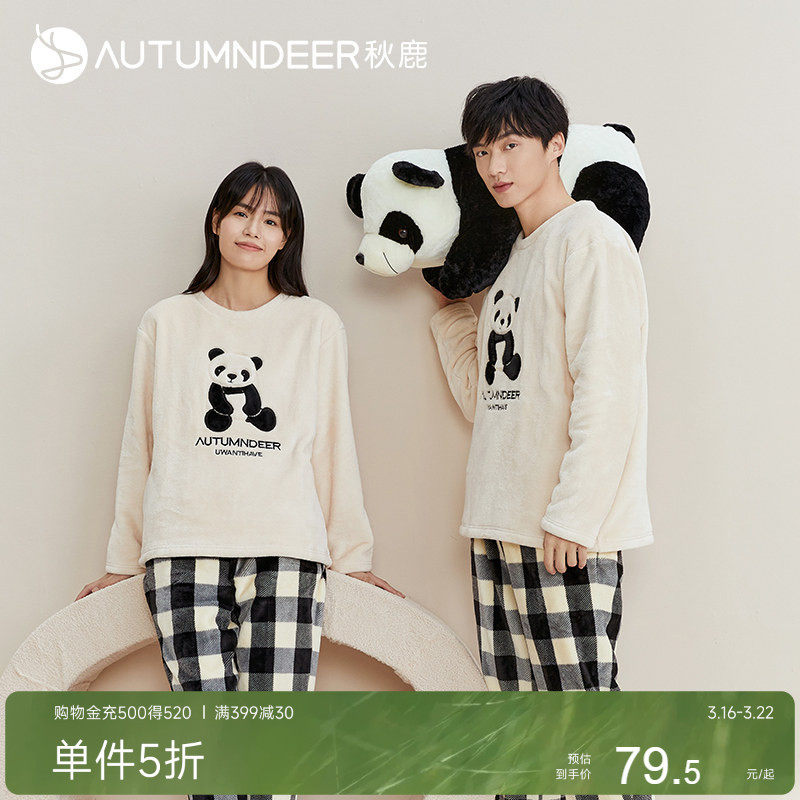 秋鹿法兰绒睡衣女冬季情侣套装可爱长袖格子长裤男士家居服秋冬款