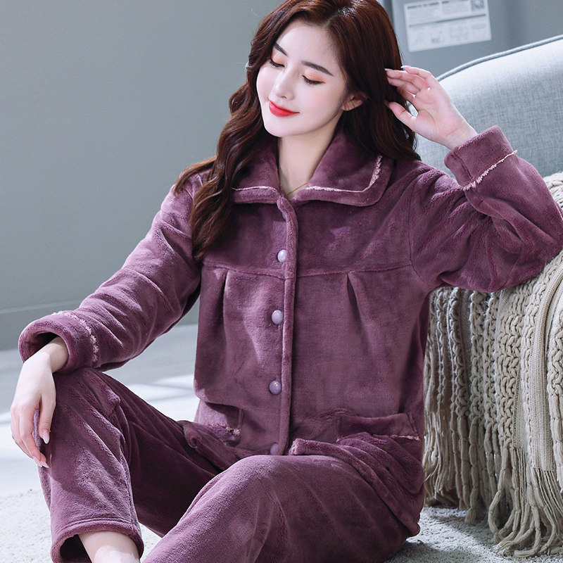 秋冬季加厚款珊瑚绒睡衣女套装家居服加绒可爱法兰绒长袖开衫大码
