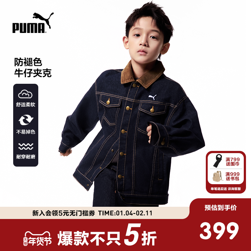 PUMA彪马童装新款牛仔外套绒面翻领拼接儿童夹克时尚耐磨牛仔衣