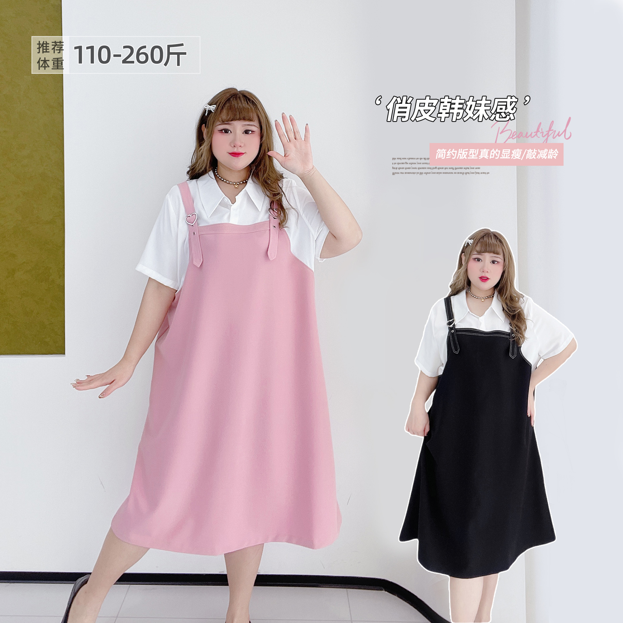胖莹莹大码女装300斤胖mm学院风减龄假两件少女感宽松背带连衣裙