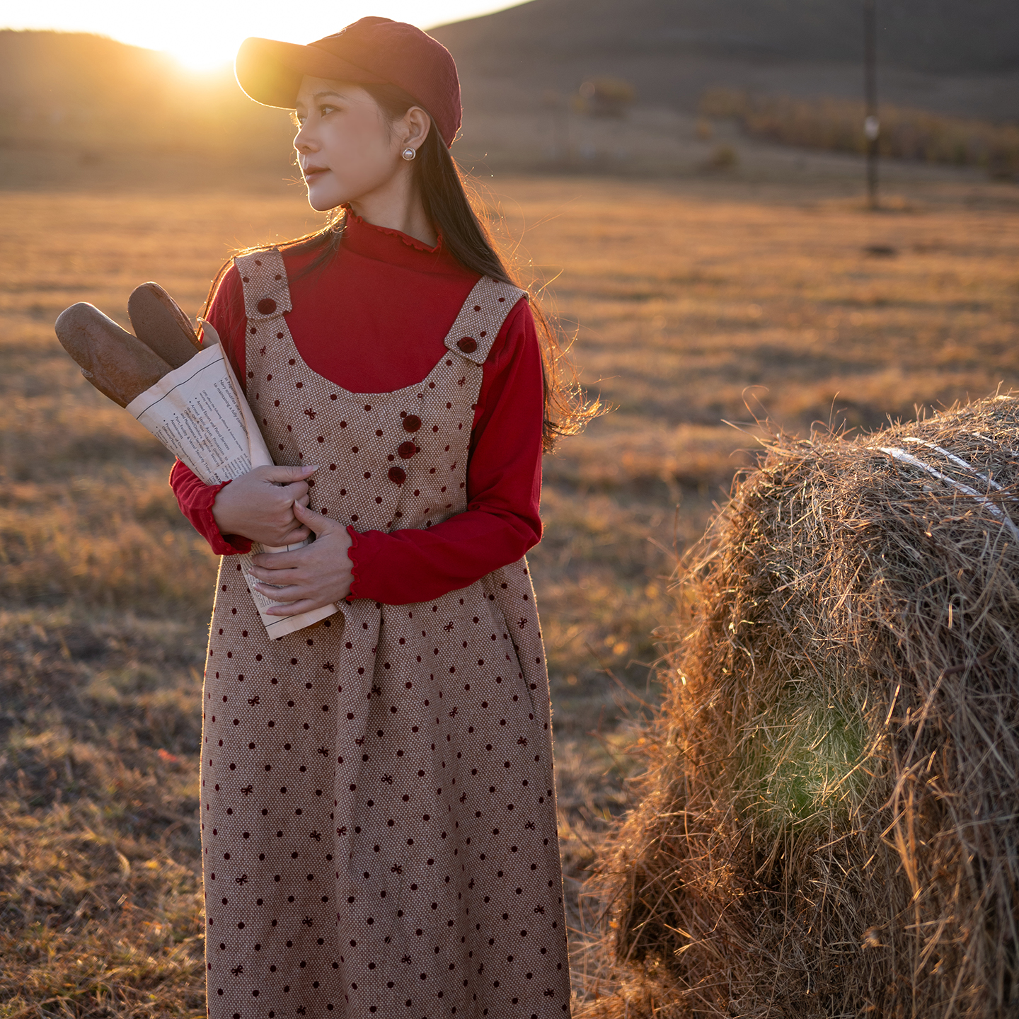 吴童童加绒加厚黑色波点背带裙女秋冬新款韩系气质宽松长款连衣裙