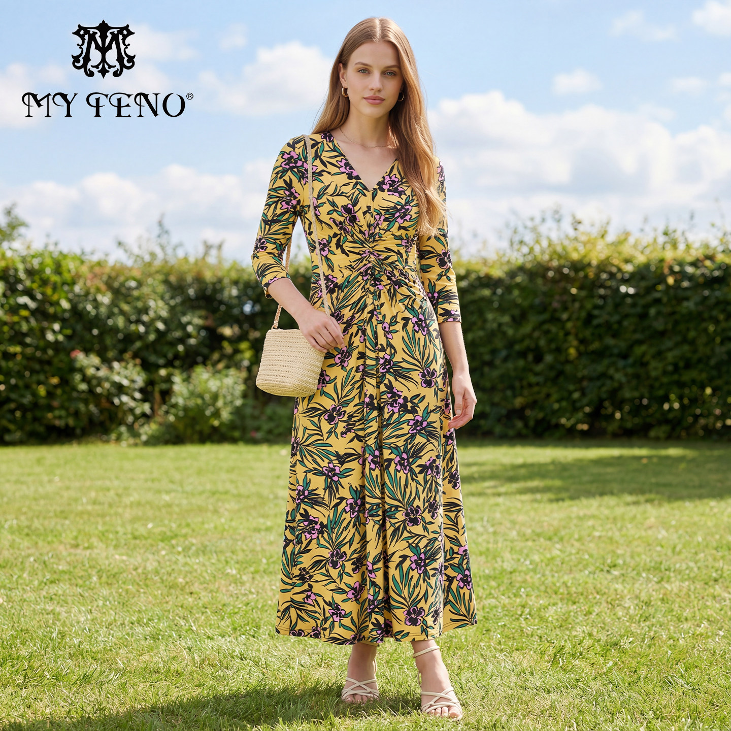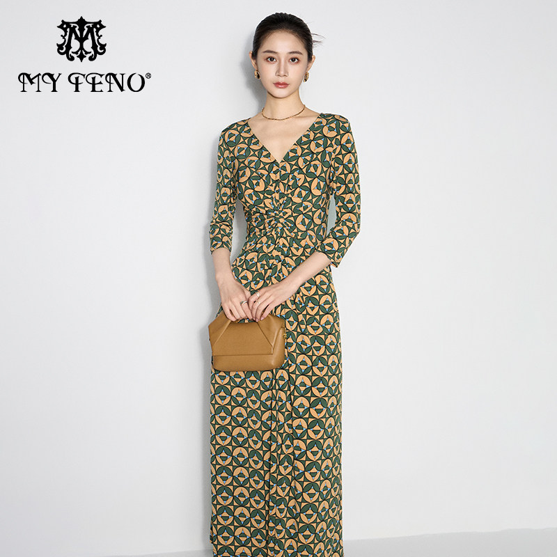 马天奴2025秋季新款黄色印花连衣裙子V领收腰修身长裙时尚气质女