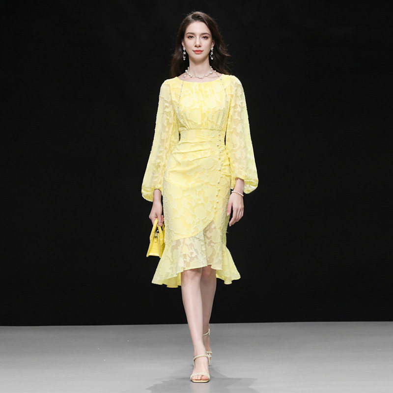 2025夏季新款气质鹅黄色灯笼袖修身收腰显瘦鱼尾连衣裙长裙女