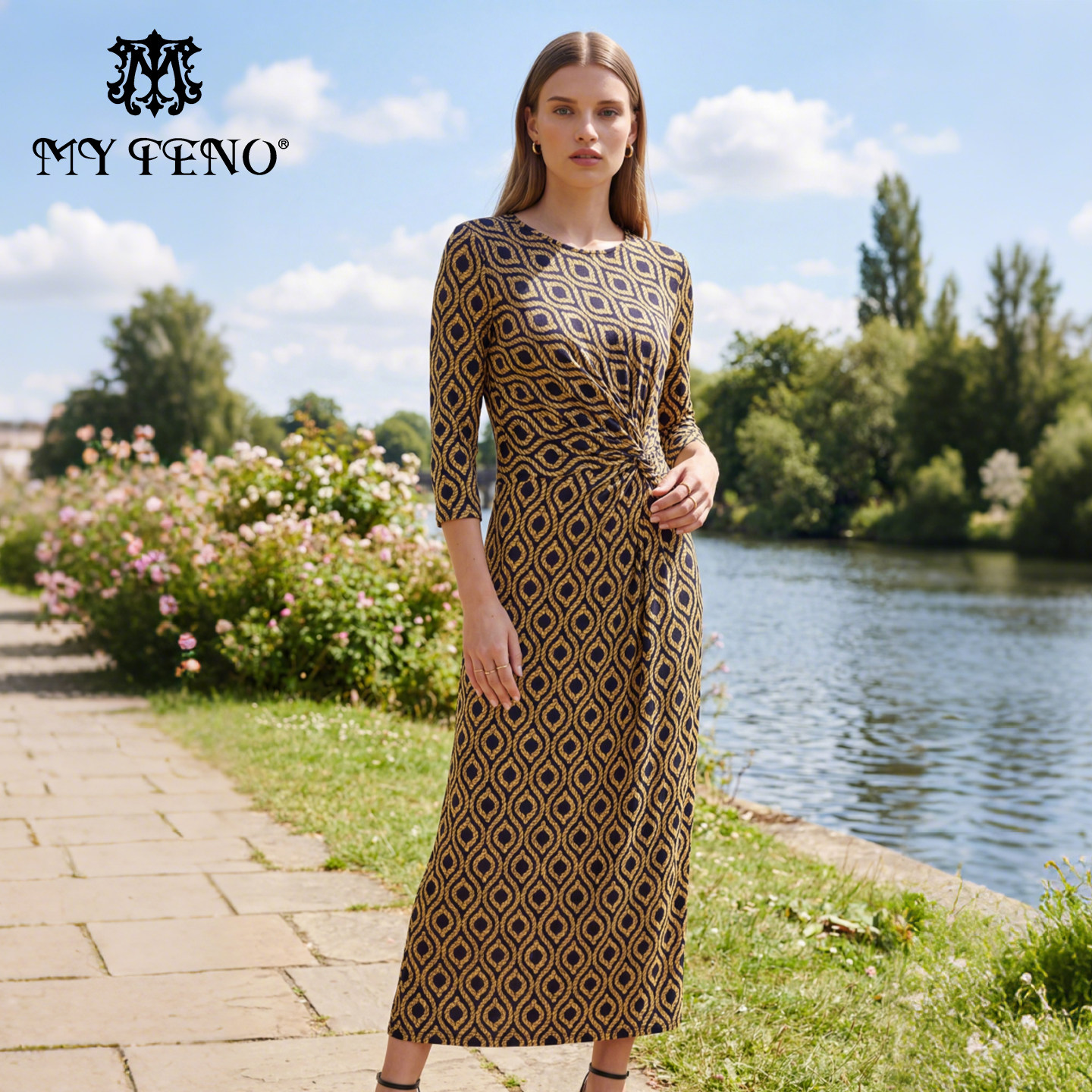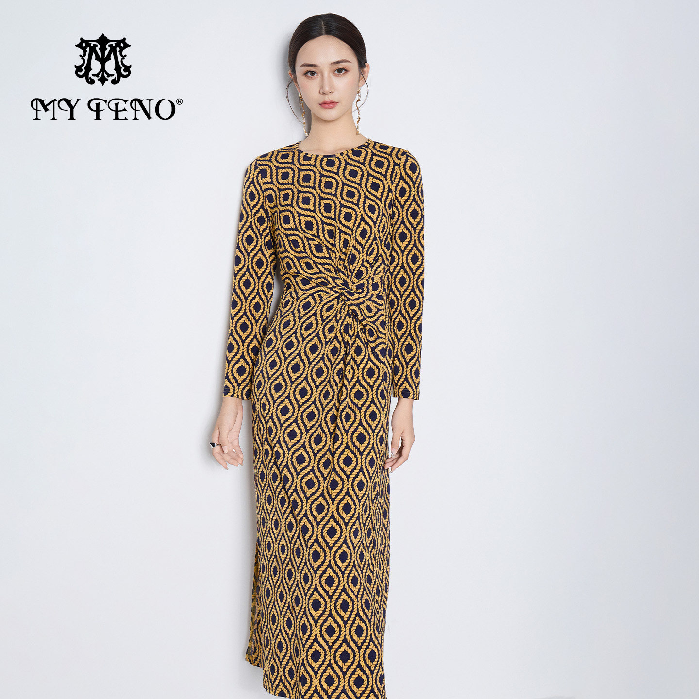 马天奴2025秋新款黄色印花圆领连衣裙子收腰修身长裙时尚气质女