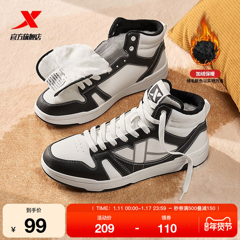 特步革面高帮棉鞋男鞋板鞋冬季保暖加绒运动休闲鞋皮面户外鞋女鞋