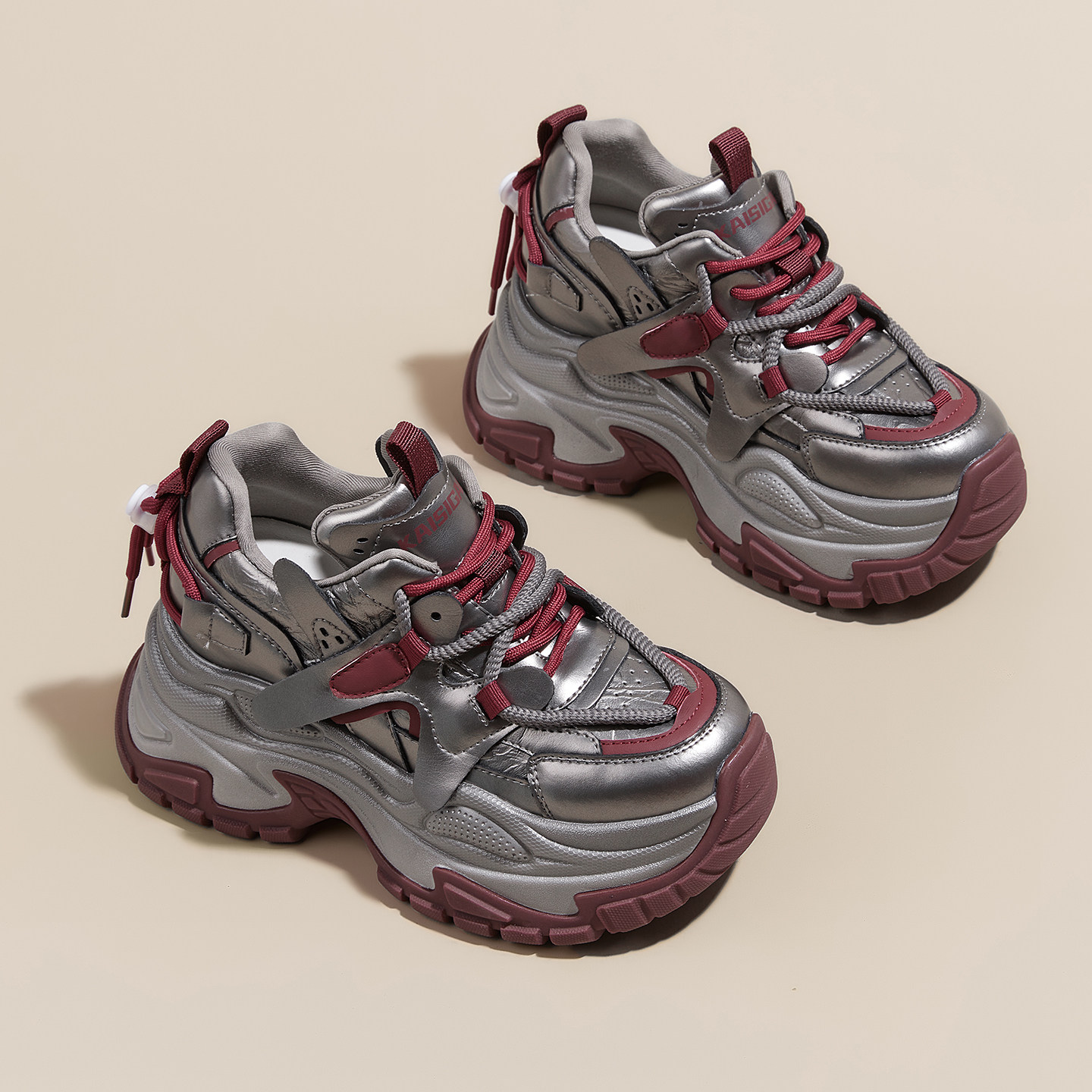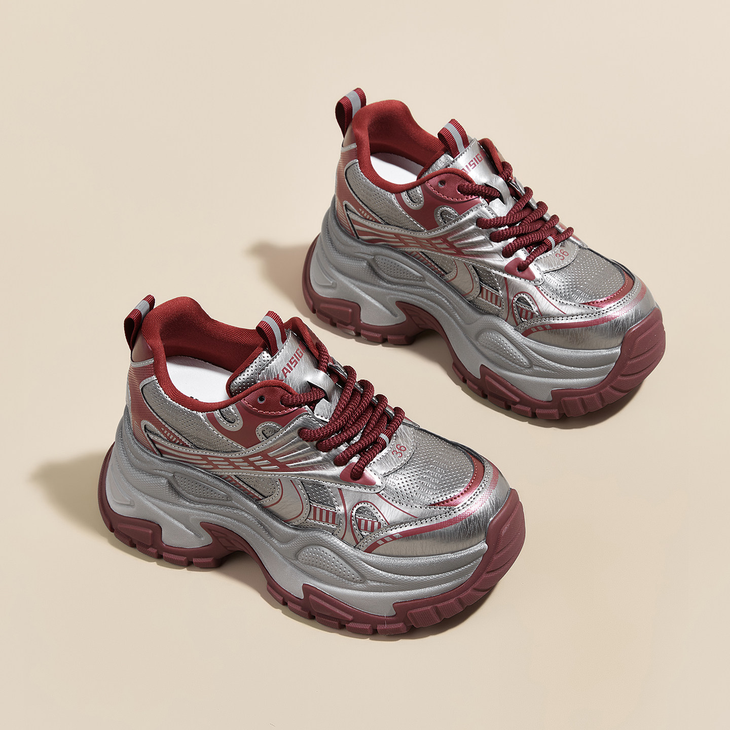 [银熠]骆驼女鞋2025秋季新款休闲加绒老爹鞋厚底增高银色运动鞋女