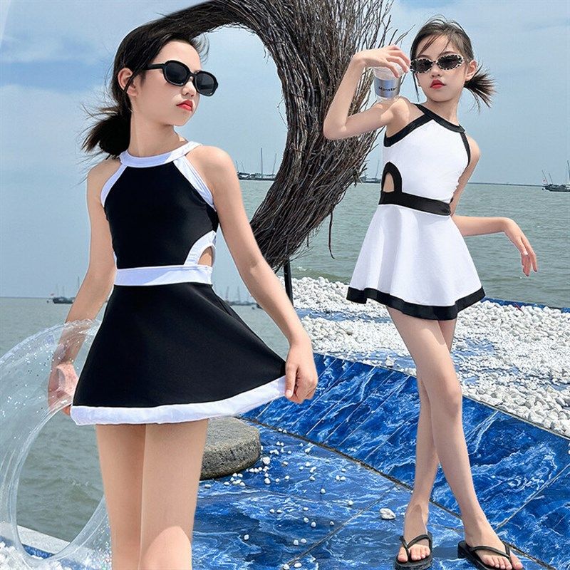 女大童泳衣夏季2024新款儿童黑白连体泳装专业网红洋气游泳衣夏天