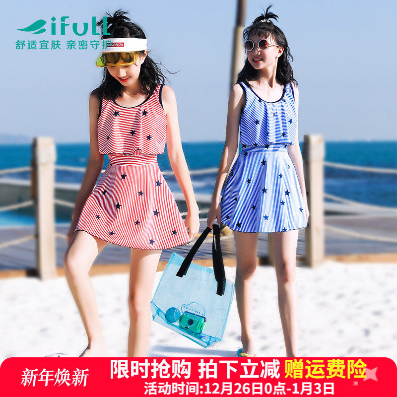女大童泳衣女孩2024新款青少年初高中学生平角保守裙式分体游泳装