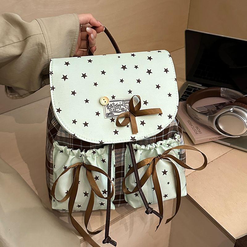2025韩版小清新星星格纹双肩包女蝴蝶结抽绳小背包少女高颜值书包