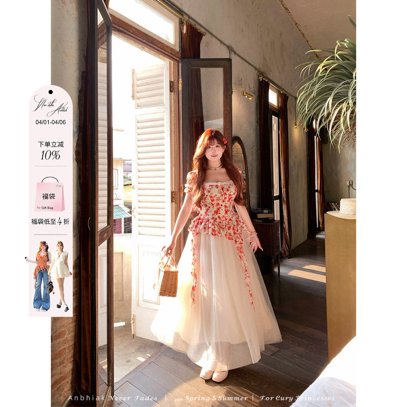 安妮不火假两件网纱拼接碎花方领连衣裙女微胖大码设计感方领裙子
