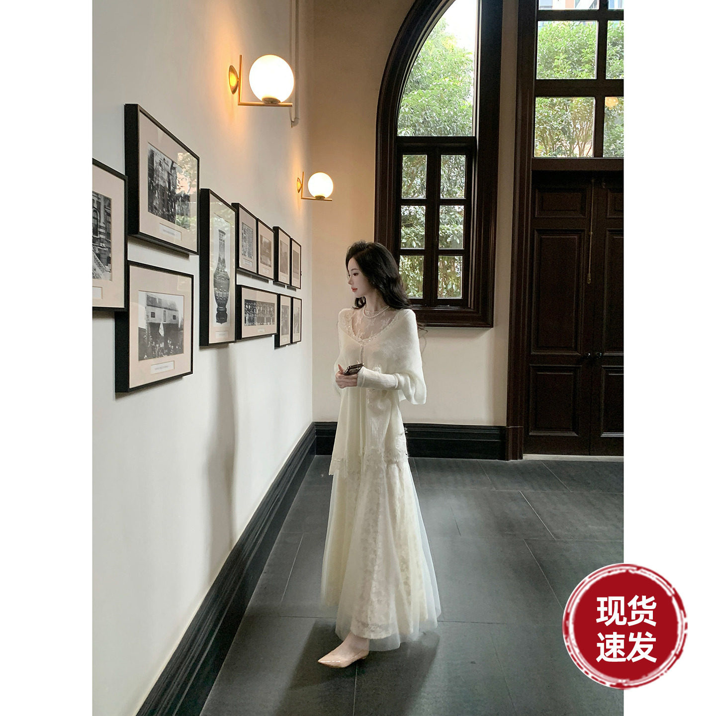 Sun雅乔【月下伊人】春秋新款清冷感针织网纱蕾丝拼接长袖连衣裙