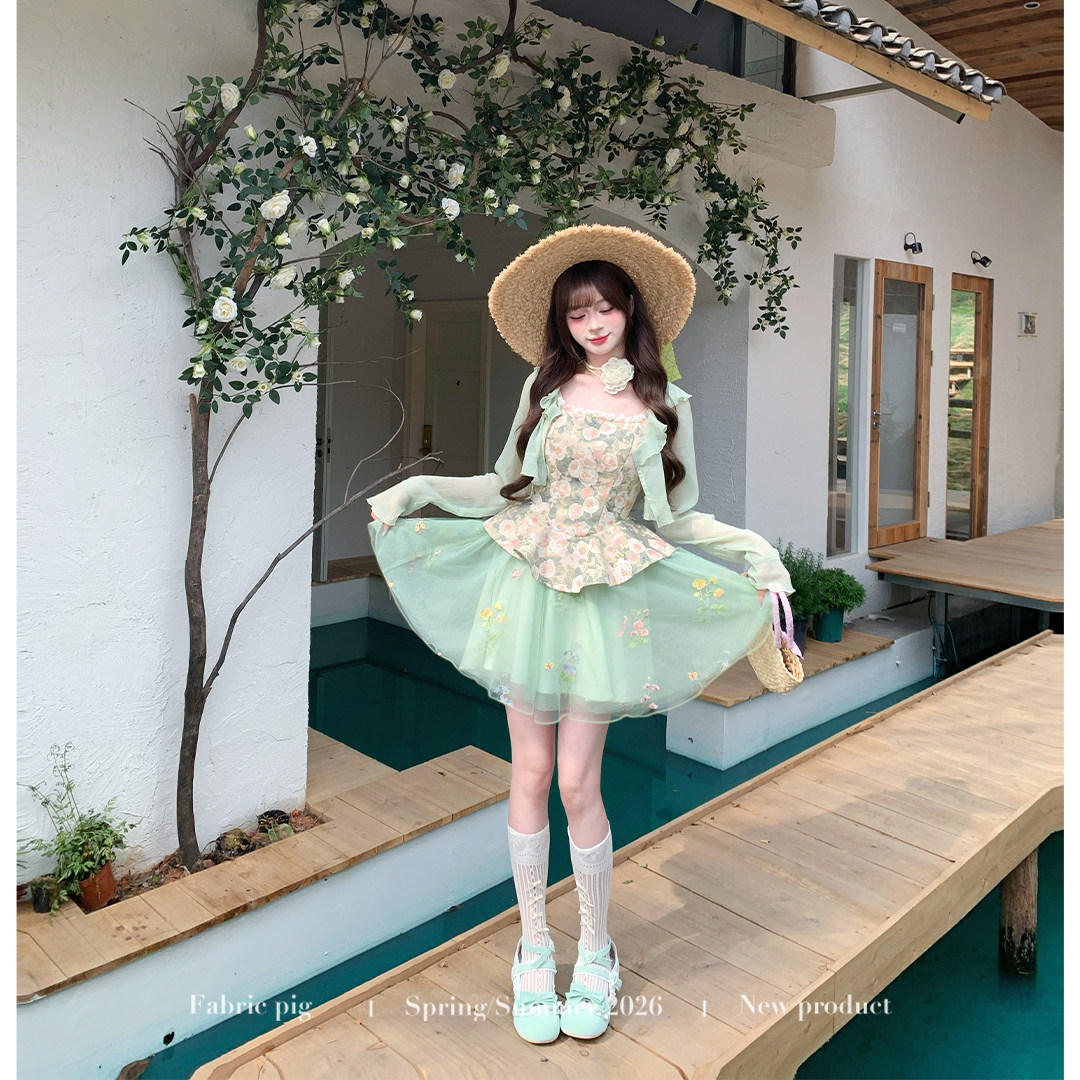 织物猪 油画软纱 浅春系拼接网纱背心连衣裙女茶歇绿色漂亮短裙子