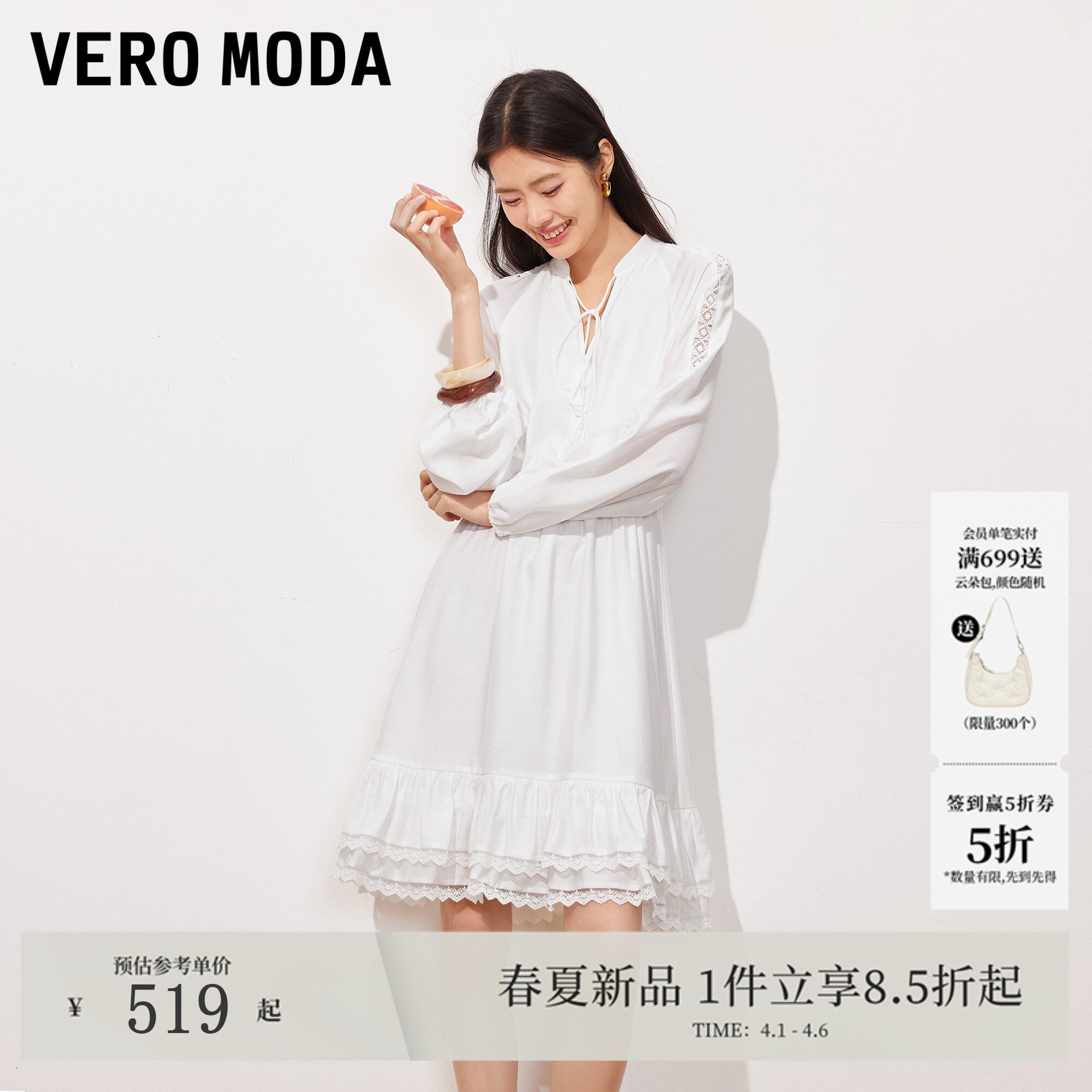 Vero Moda连衣裙2026夏季新款胸前系带拼接蕾丝袖网纱裙时尚风