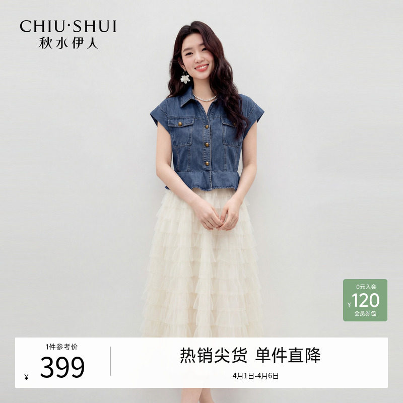 秋水伊人温柔拼接蛋糕网纱连衣裙2026年夏季新款经典翻领设计裙子