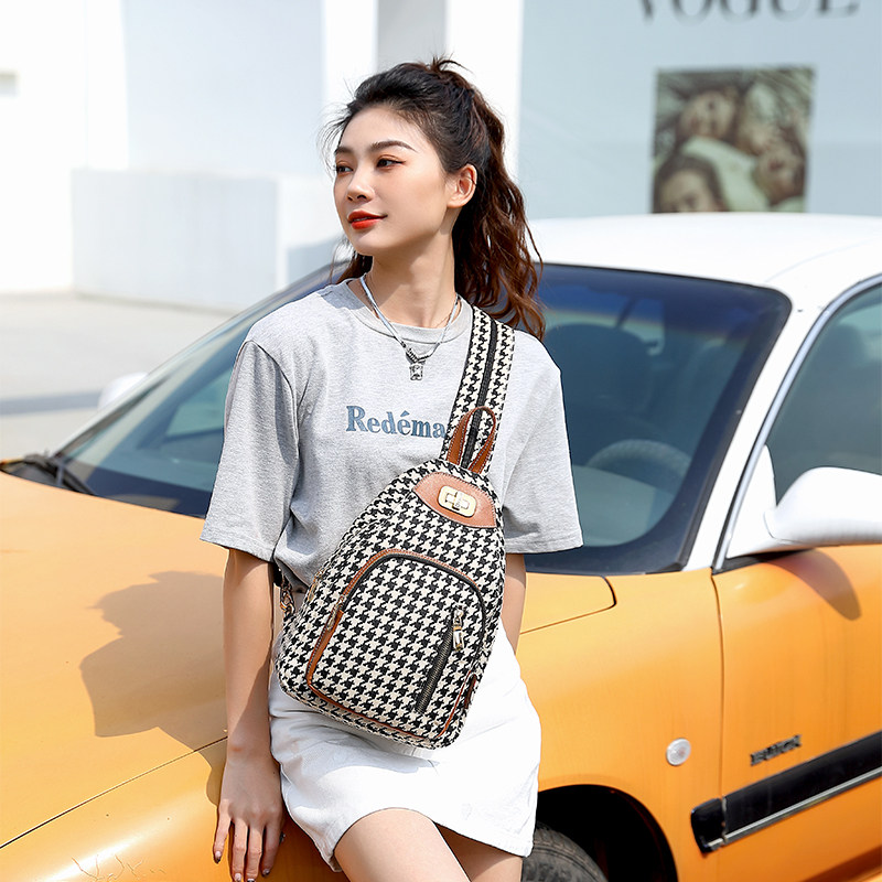 新款时尚胸包女千鸟格单肩包潮流斜跨包胸前包帆布双肩斜挎两用包