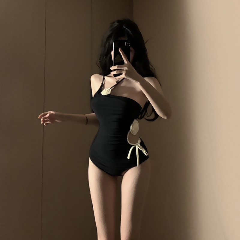 新款性感连体泳衣女双肩带手工花朵纯欲网红风高级感显瘦温泉小胸