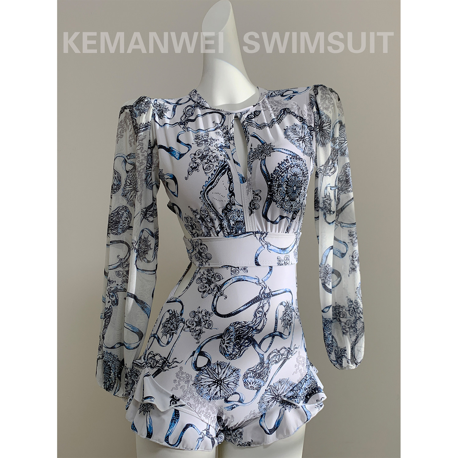 【青花珐琅】复古镂空性感连体泳衣女长袖遮肉显瘦新款泡温泉泳装
