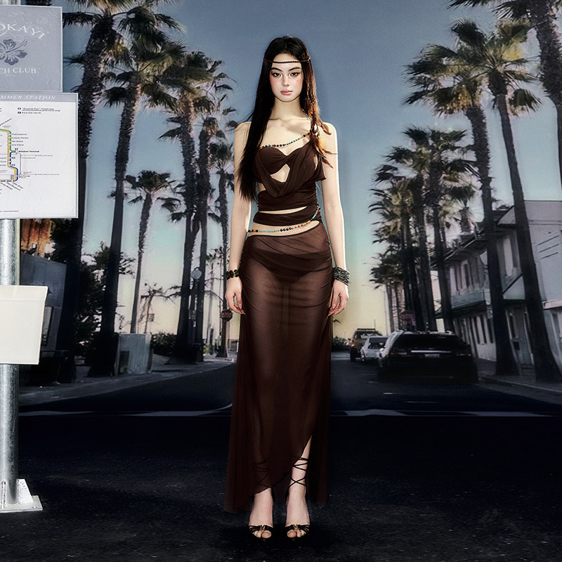 罗卡艺2025新款夏日海岛度假网纱长裙荡领珠链显瘦性感连体泳衣女