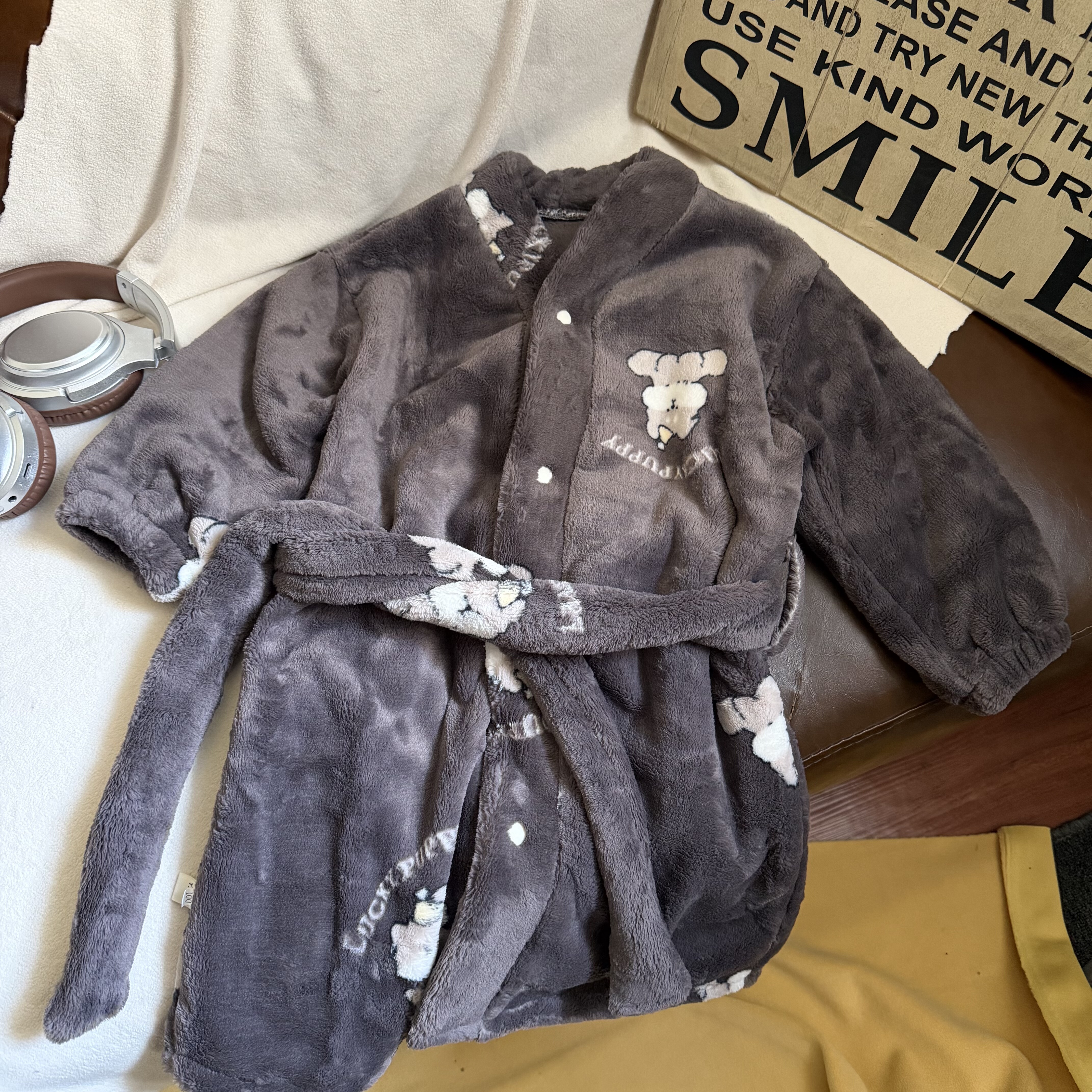 雪宝宝童装 甜美小熊印花半边绒睡袍 男童冬季加厚保暖系带家居服