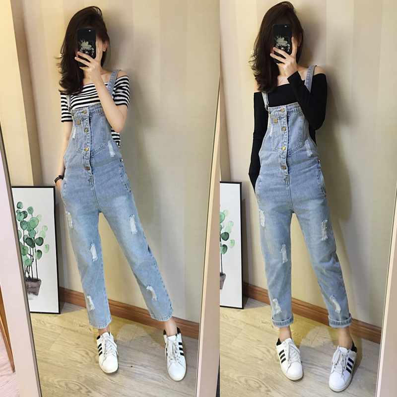 牛仔背带裤女春季学生韩版2017新款九分裤bf风宽松春装破洞连体裤