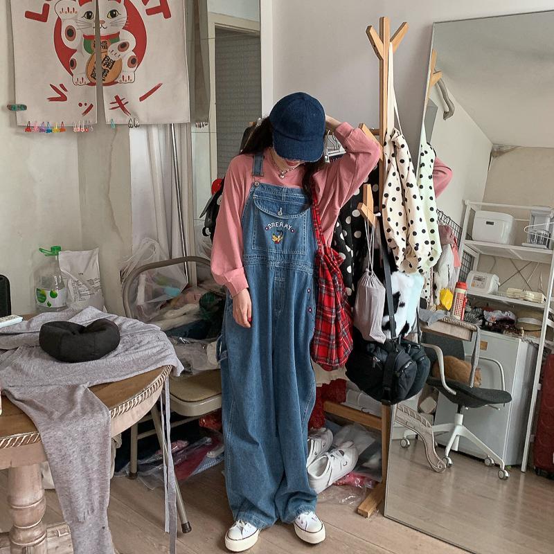 牛仔背带裤女2021春季韩版新款宽松学院BF风可爱卡通刺绣百搭裤子