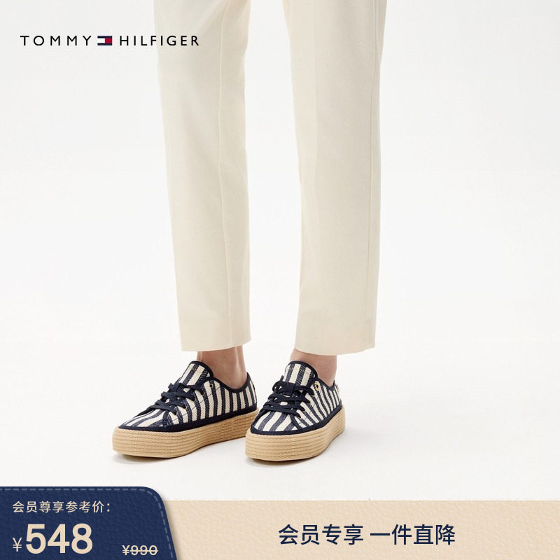 Tommy女装简约金属字母标撞色条纹厚底复古休闲鞋草编鞋渔夫鞋
