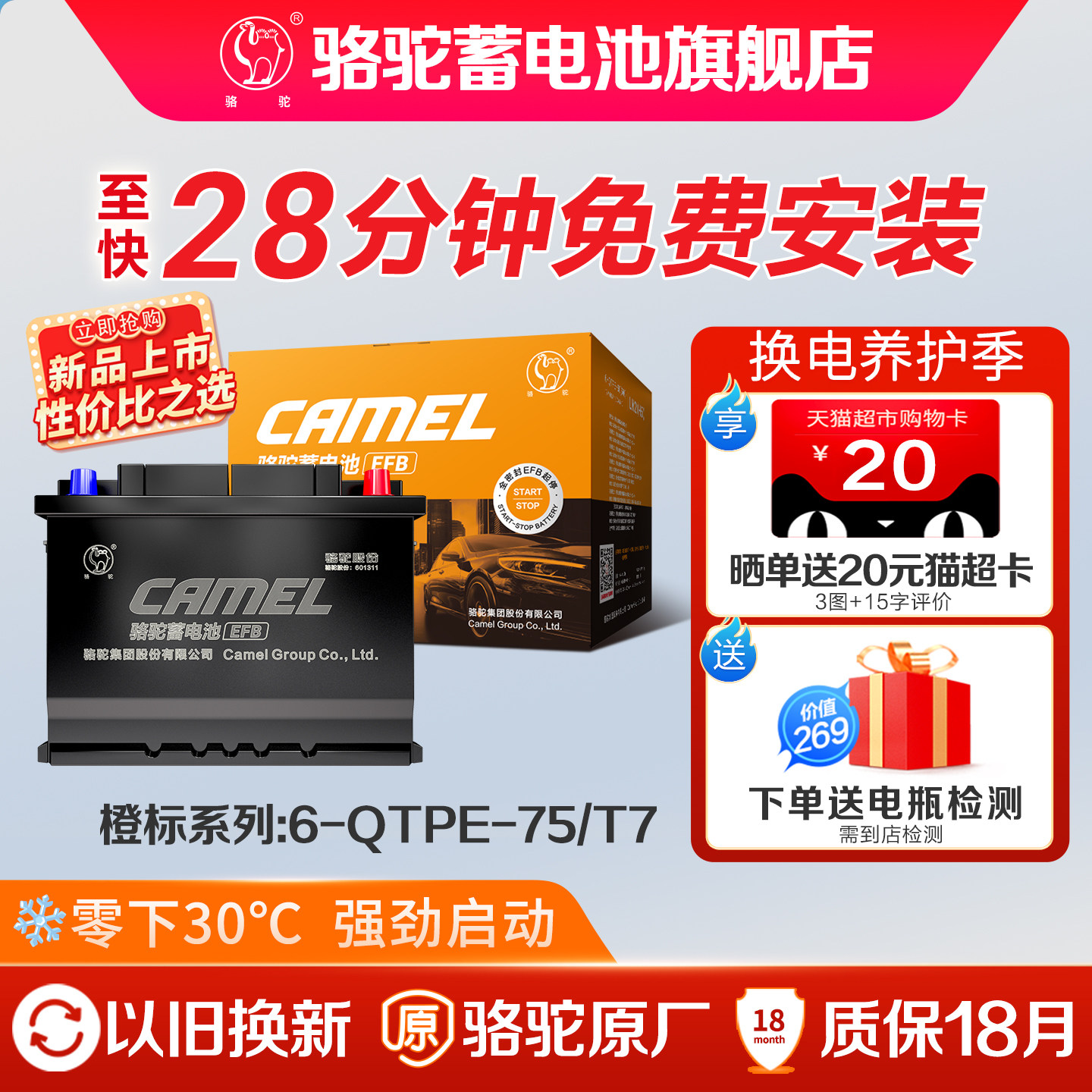 骆驼蓄电池橙标EFB75汽车启停电瓶T7适福特福克斯蒙迪欧锐界翼虎