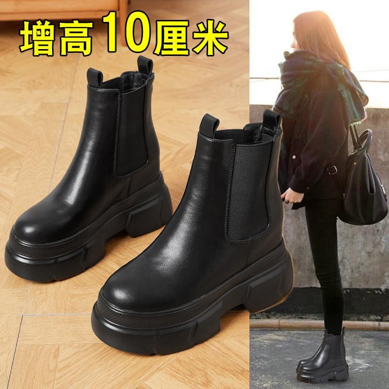 增高10厘米切尔西烟筒靴松糕厚底小个子马丁靴内增高女靴高跟短靴