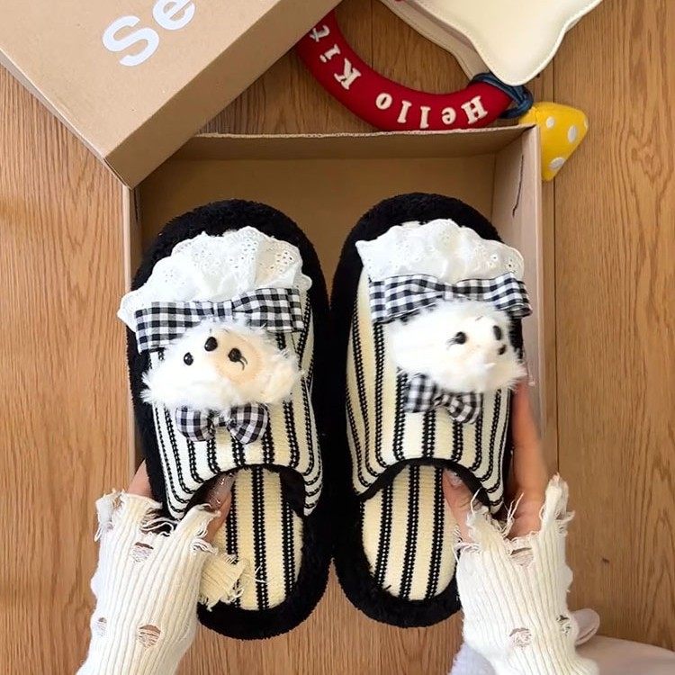 爆品冬季拖鞋女外穿毛毛棉鞋防滑保暖加绒包跟豆豆鞋可爱卡通可外