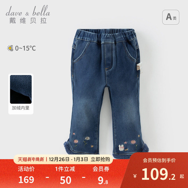 戴维贝拉儿童裤子2025新款冬装女童加绒播啊暖微喇牛仔宝宝九分裤