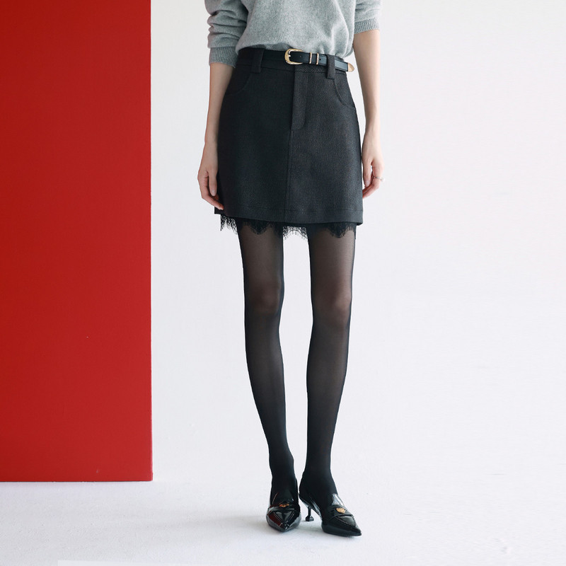 伊芙丽时髦百搭质感拼接蕾丝短裙2024冬季新款气质设计感茶歇半裙