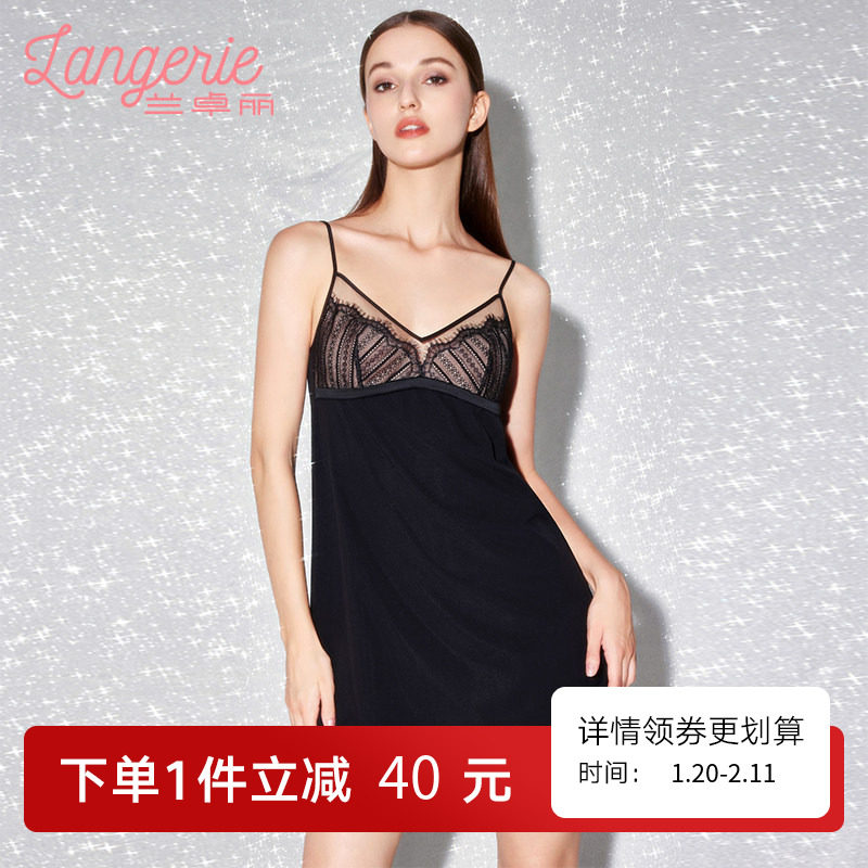兰卓丽商场同款性感细肩带吊带睡裙女士轻薄蕾丝短裙深V美背睡衣